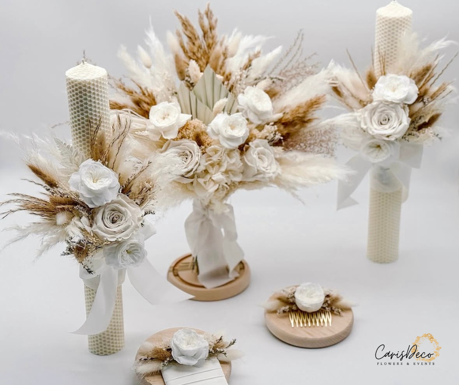 Set buchet mireasă, cocardă, pieptene și lumânări de nuntă – alb & bej