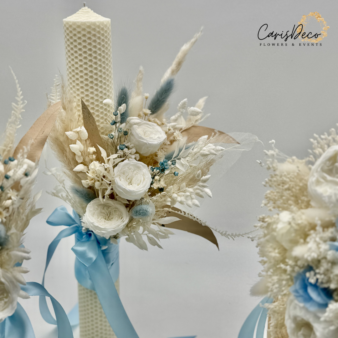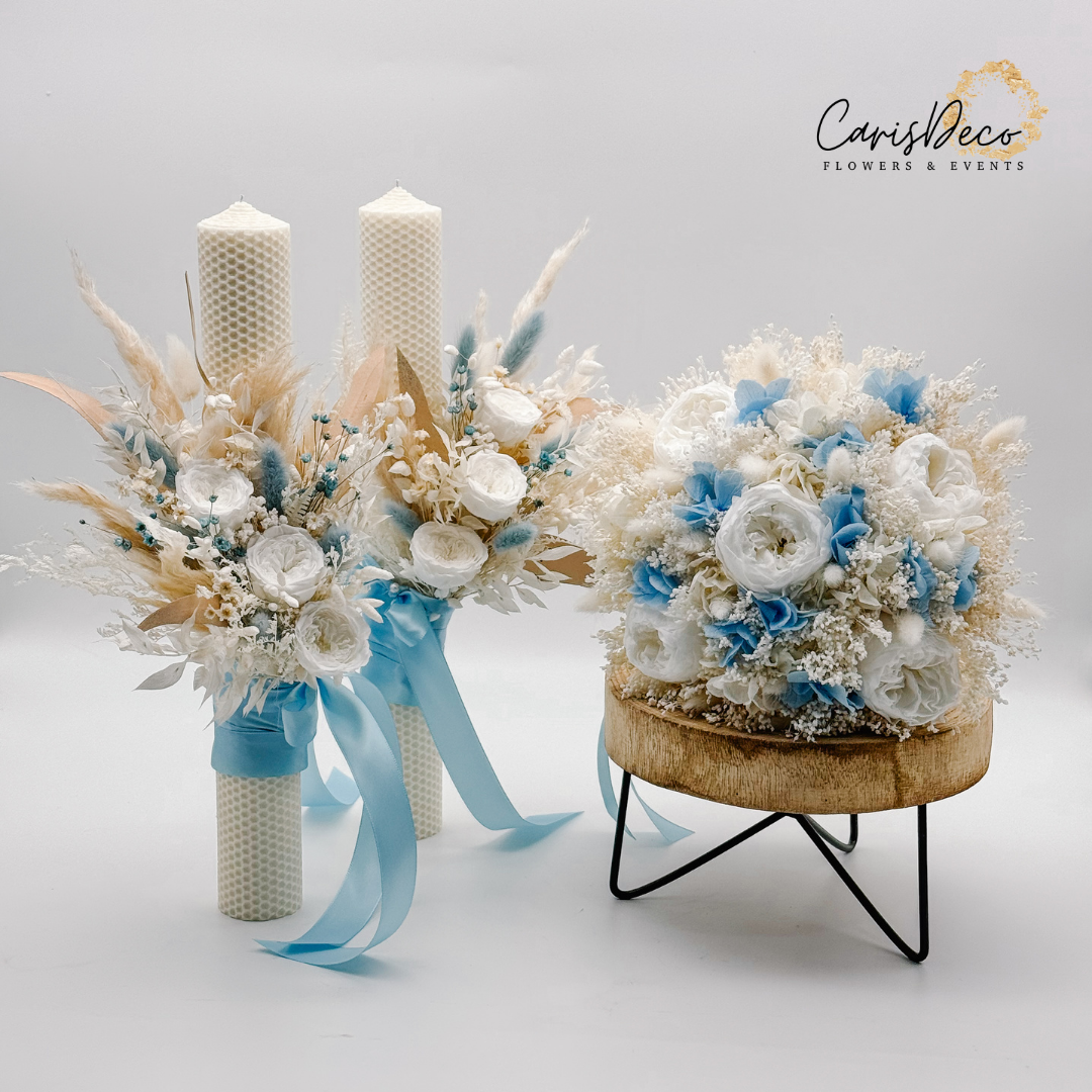 Set buchet mireasă și lumânări de nuntă – alb, baby blue & crem
