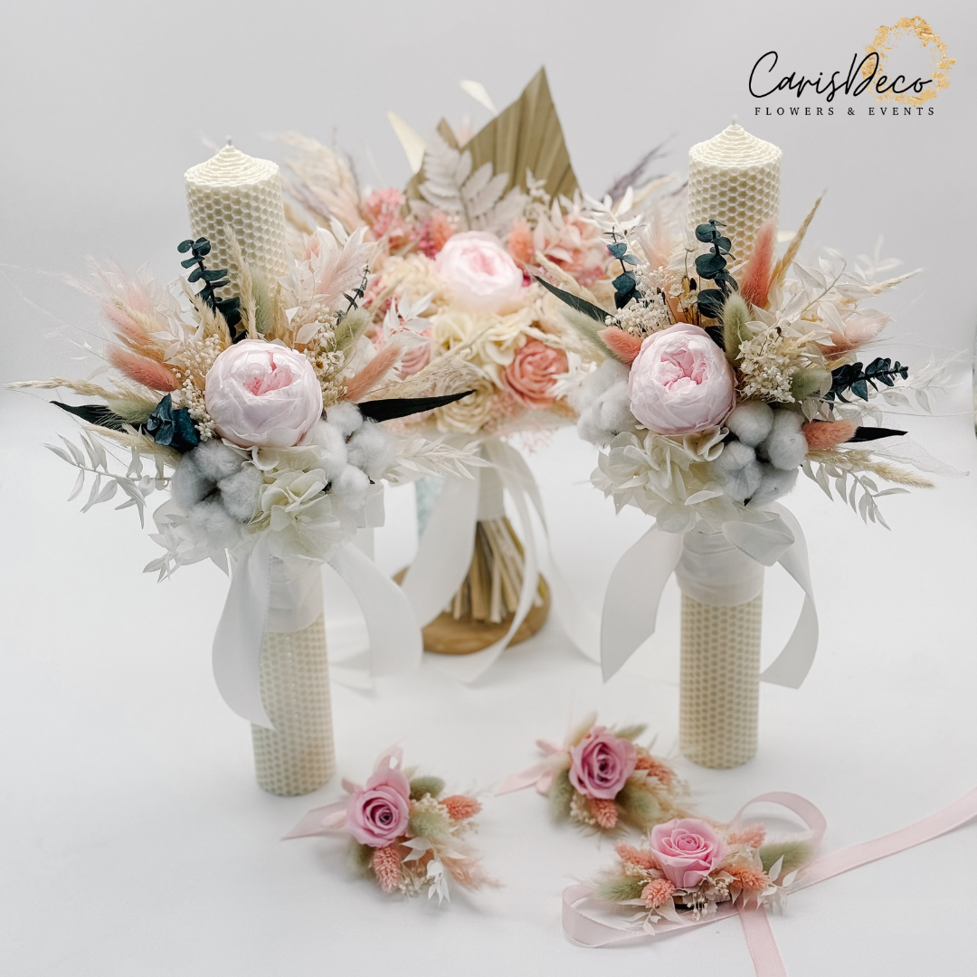 Set buchet mireasă, cocardă, brățară și lumânări de nuntă – alb & roz
