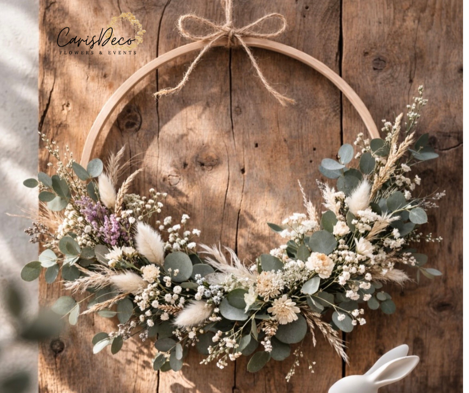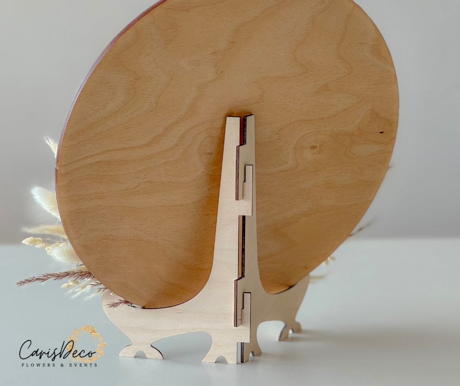 Decorațiune din lemn, gravată cu mesaj personalizabil, decorată cu flori naturale, conservate și criogenate culori pastel.